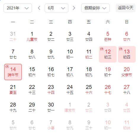 端午节为每年农历五月初五,又称端阳节、午日节、五月节等。2021年端午节在6月14日(星期一),2021端午节放假时间是6月12日(星期六)-6月14日(星期一)。